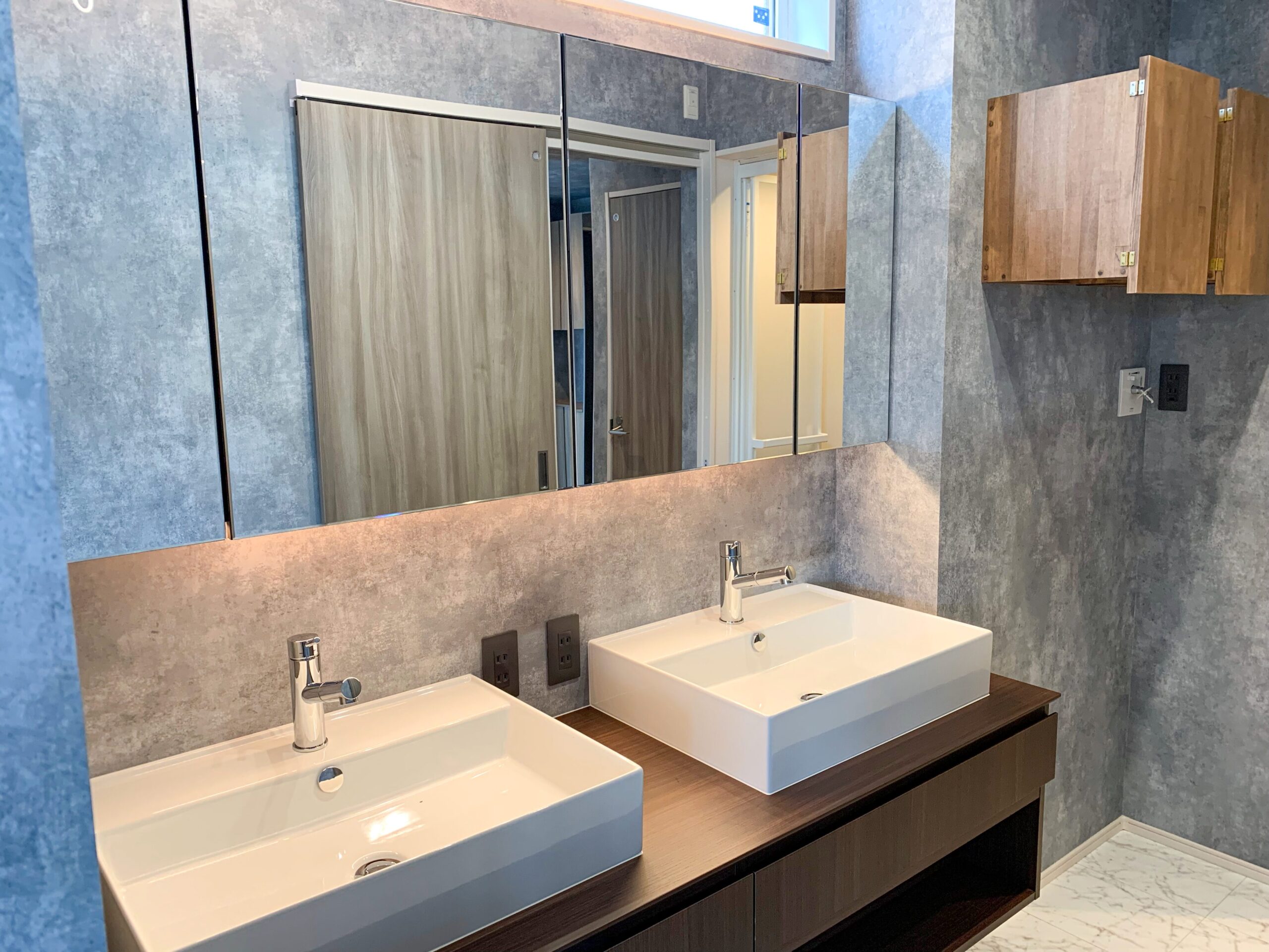 忙しい朝でも自分のペースで身支度できるよう、ツインボウルタイプの洗面台を採用し、大きな鏡を取り付けました。