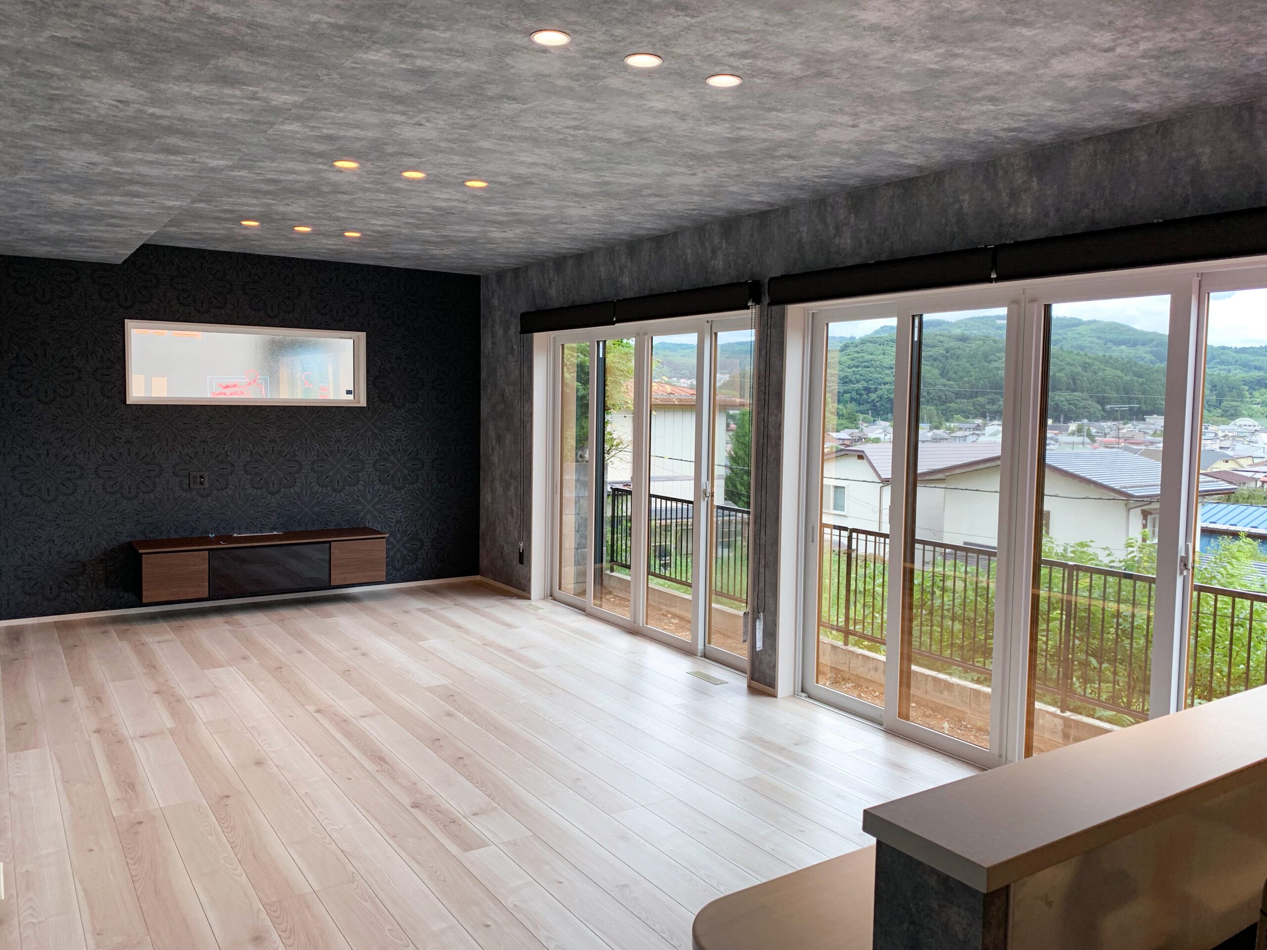 無機質でカッコイイ雰囲気のLDKは約20帖。建物の南側に贅沢に配した窓がさらに開放感を演出します。腰壁にはカウンターを設け、まるでバーのよう。