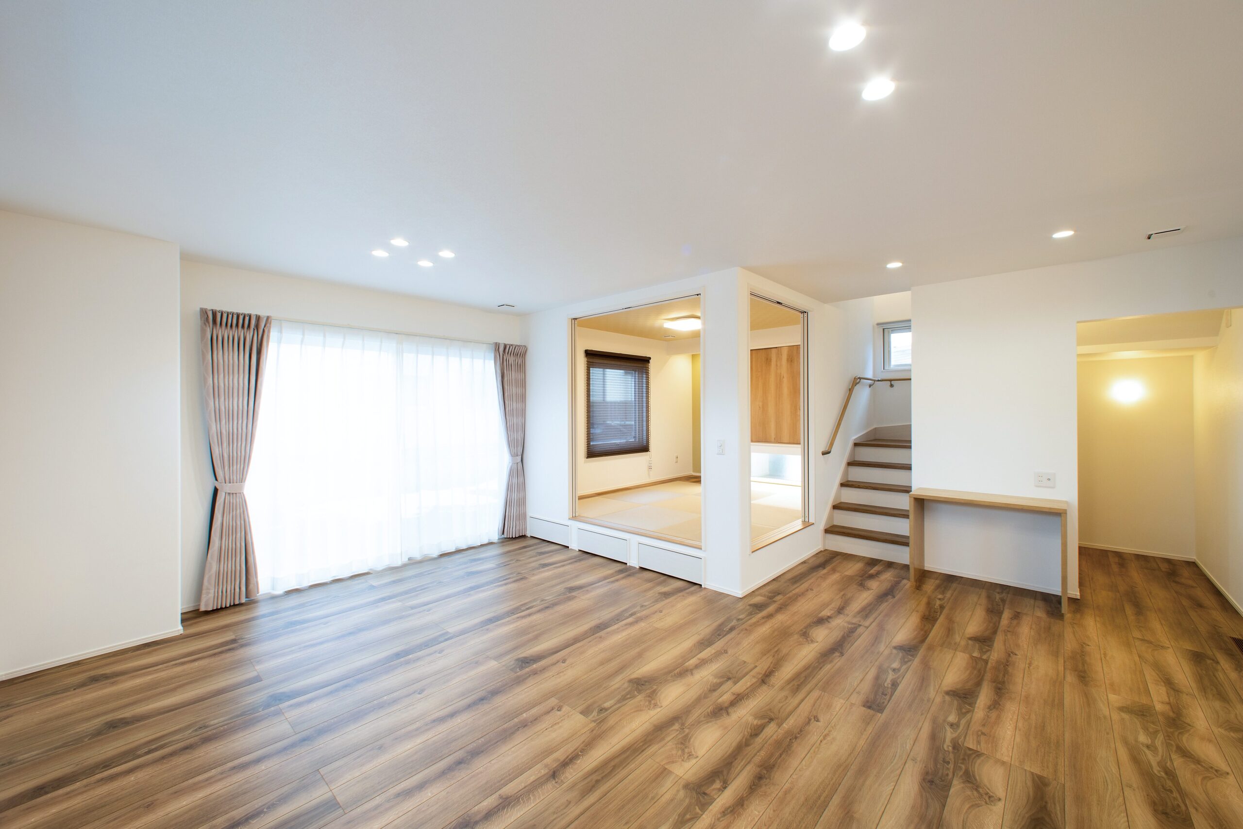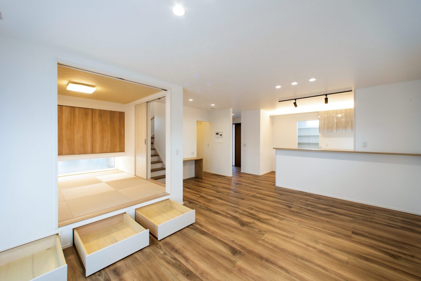 19帖のLDKと6帖の小上がり和室を設け、仕切りを最小限にすることでワンルームのような大空間へ。