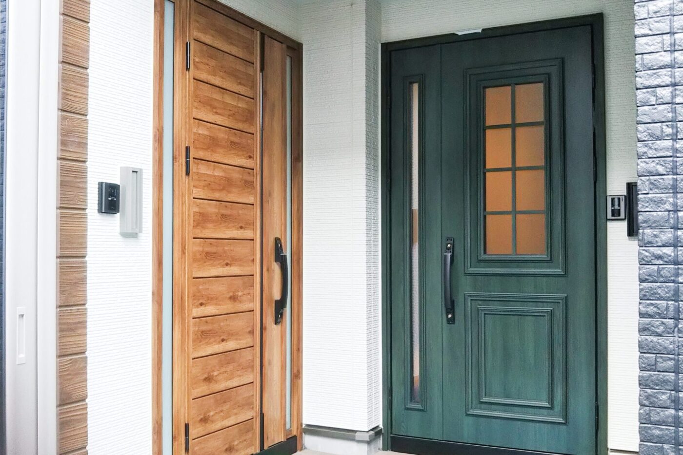 独立した二つの二世帯を、一つ屋根の下に。木のドアと緑色のドア、それぞれのドアを開けると、間取りもインテリアも異なる、それぞれの世帯の好みやライフスタイルに合わせた住まいが広がります。
