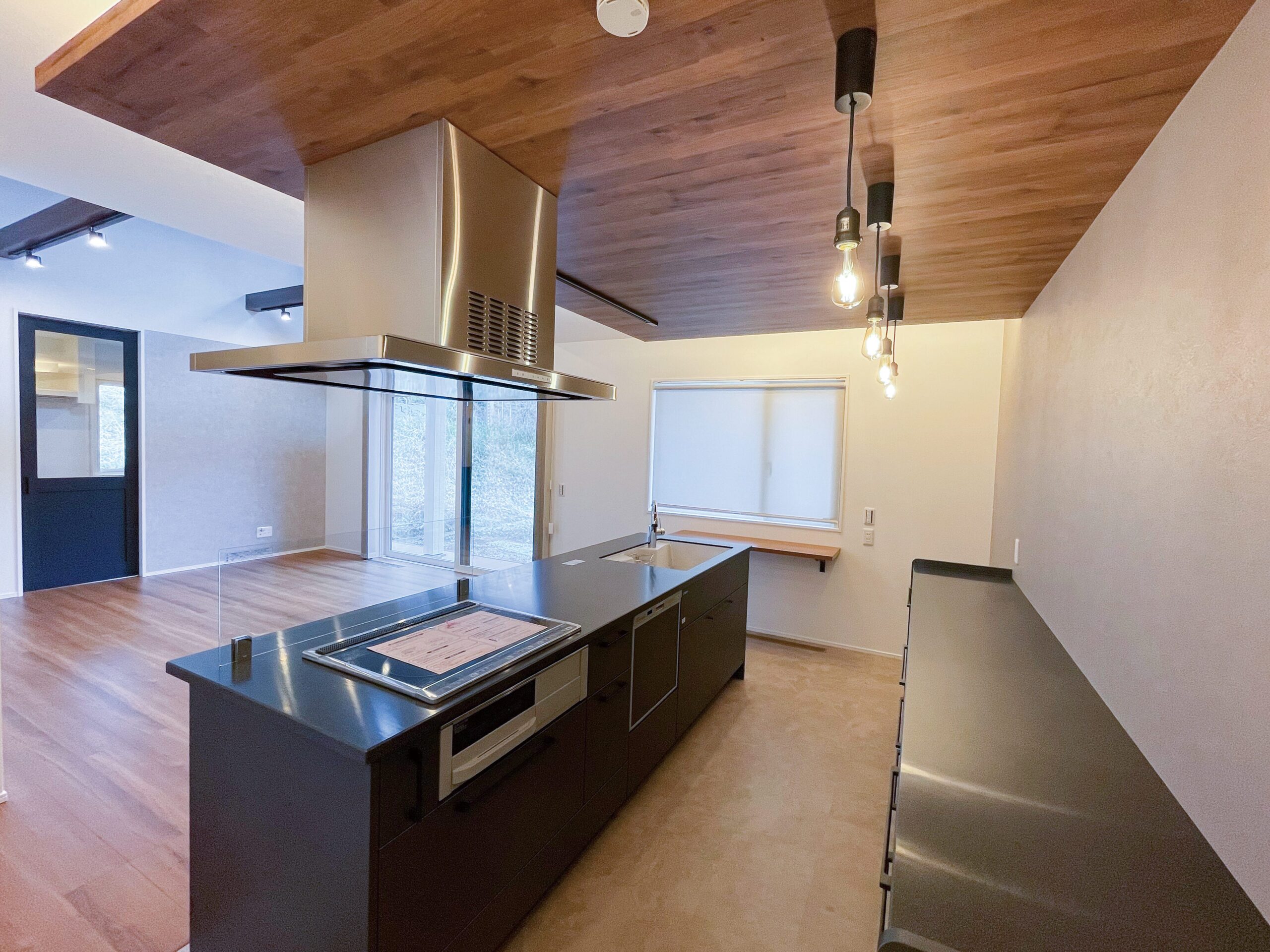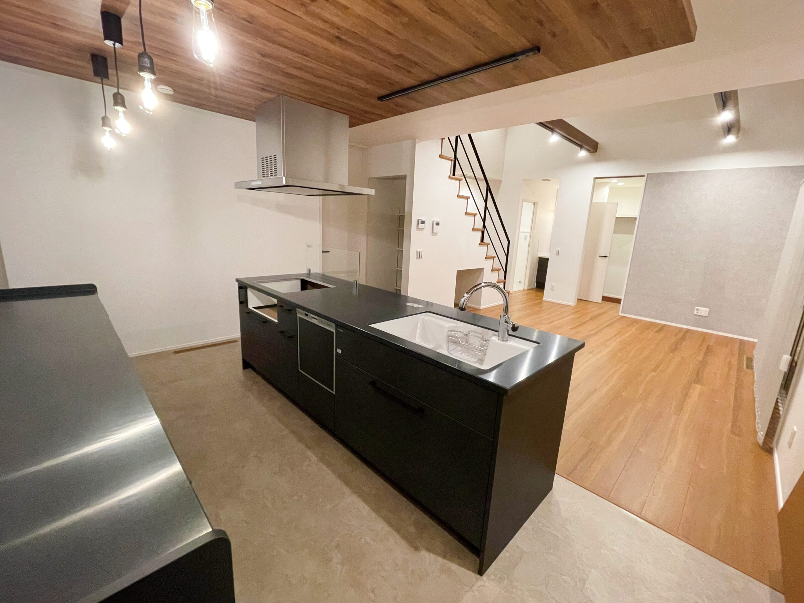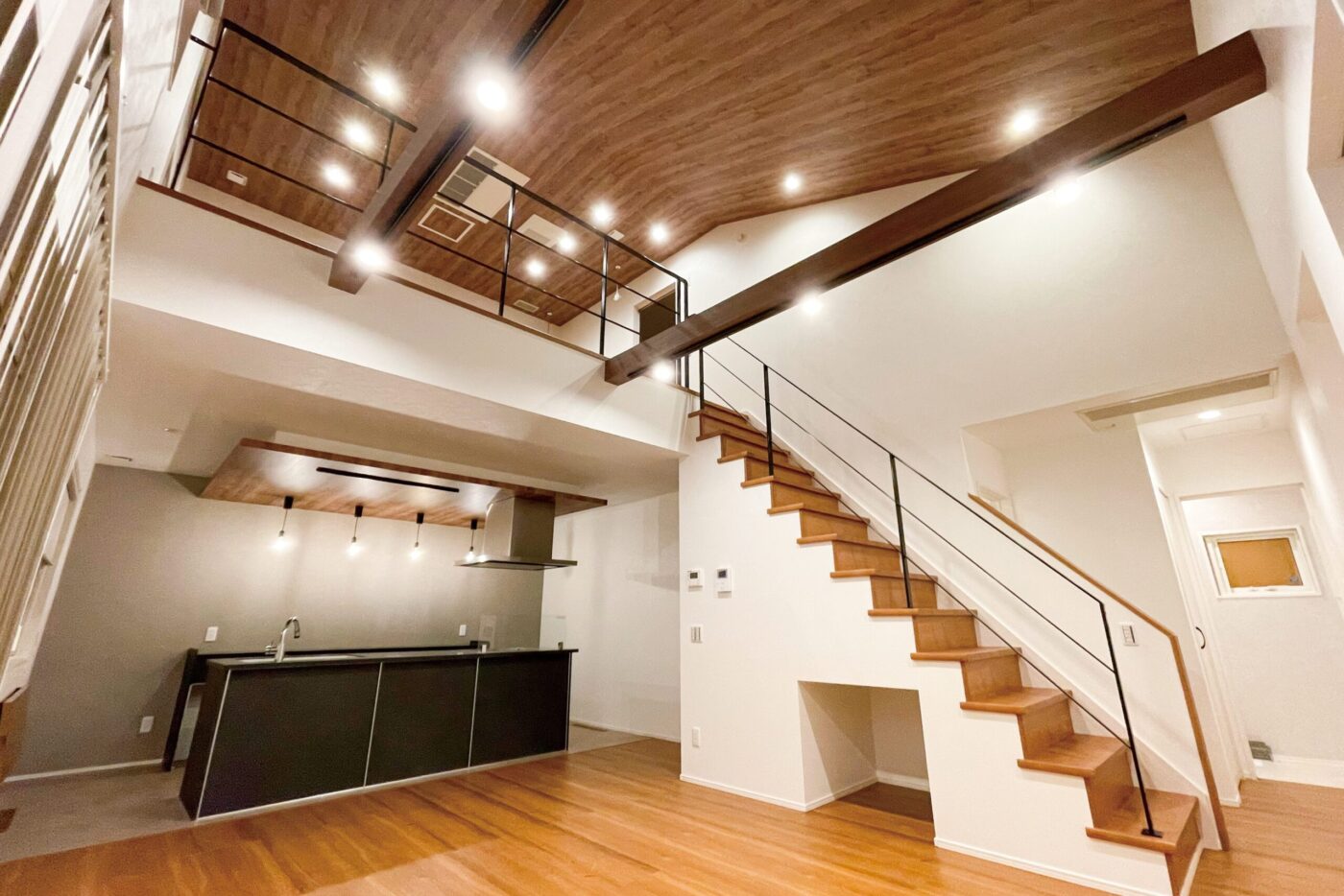 木目の下がり天井、重厚感あるアイランドキッチン、魅せるリビング階段。